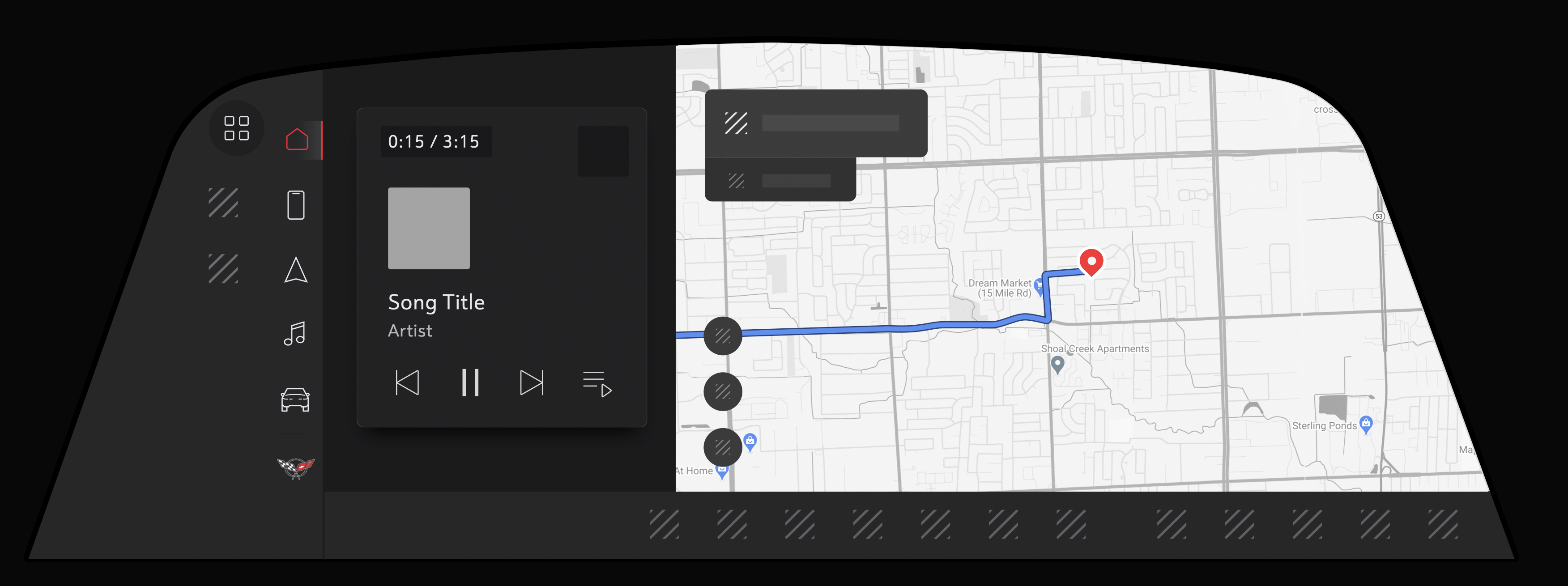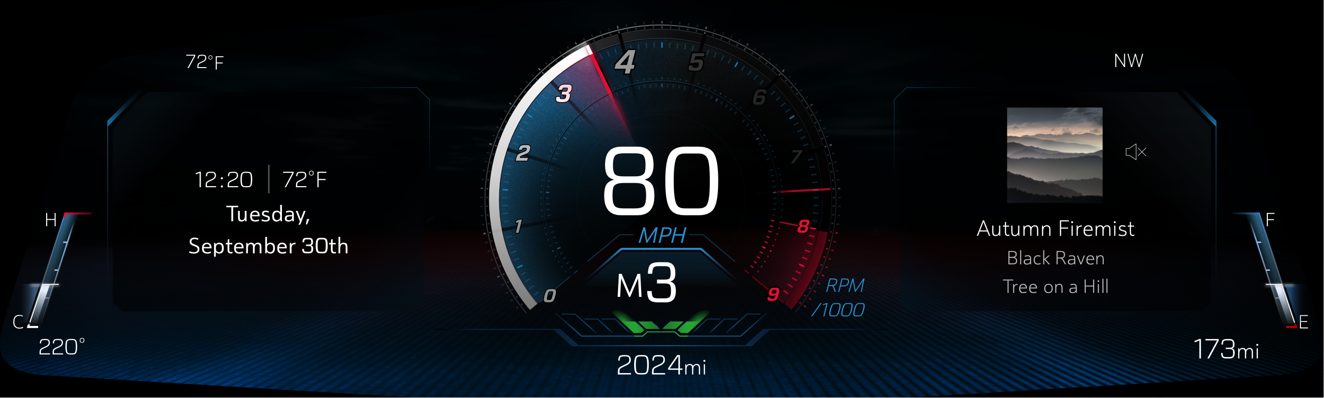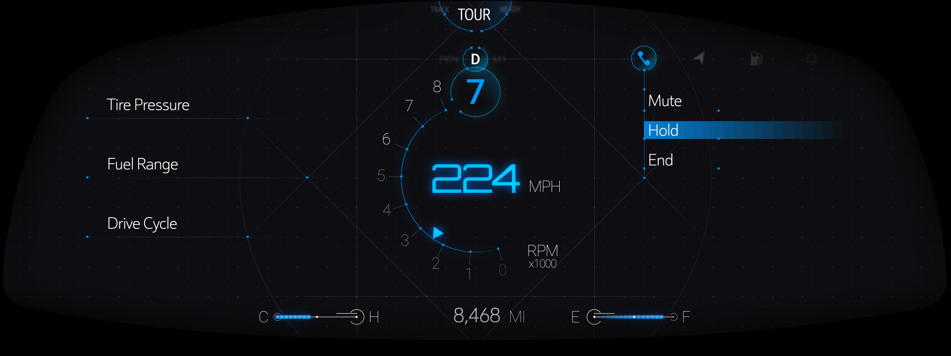 I ensured the graphics were properly implemented into the design system. I led, reviewed and critiqued the typography and iconography development. I ensured ISO standards were met, safety and regulatory best practices as well as GM best practices. I also reviewed and critiqued the 3D development of assets in the interface particularly vehicle imagery and realtime assets. I also worked with software on almost a daily basis ensuring gaps were closed, issues were resolved and that our teams were working as closely as possible.