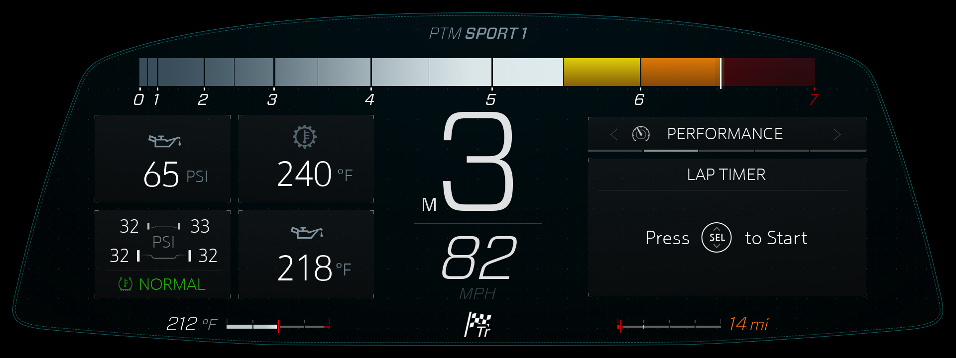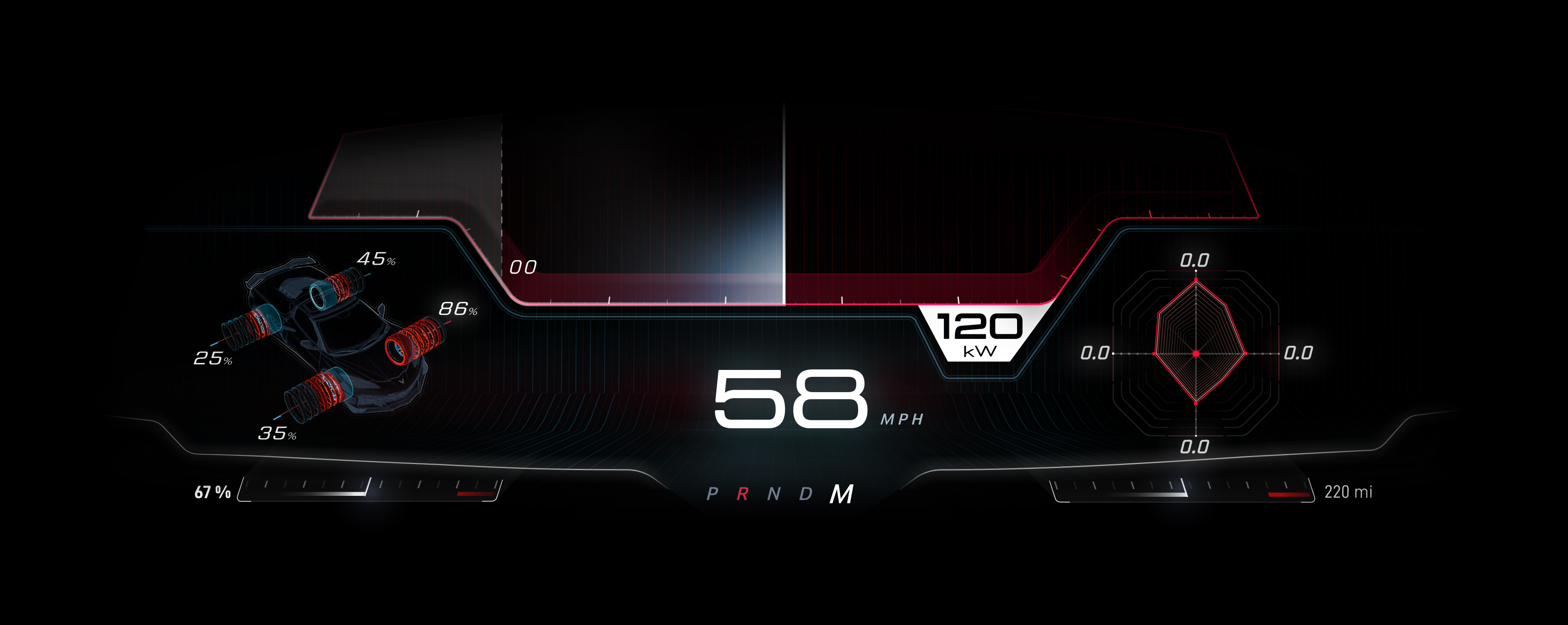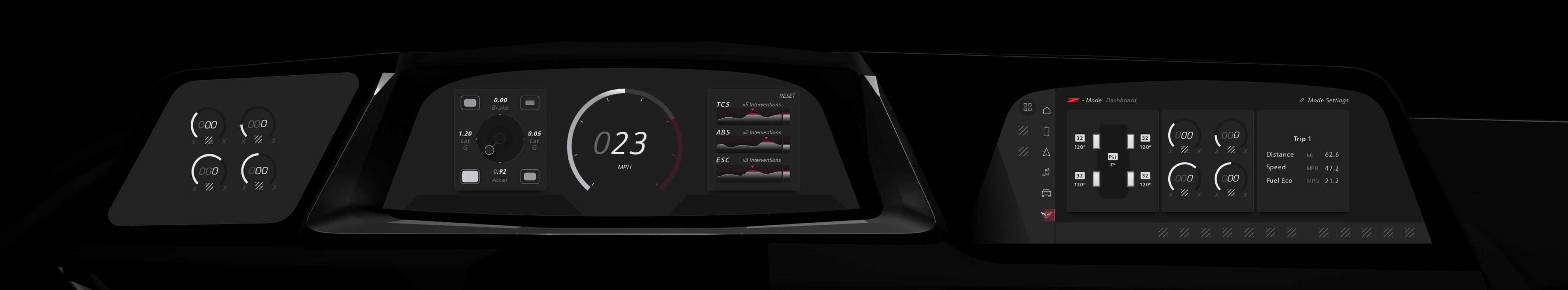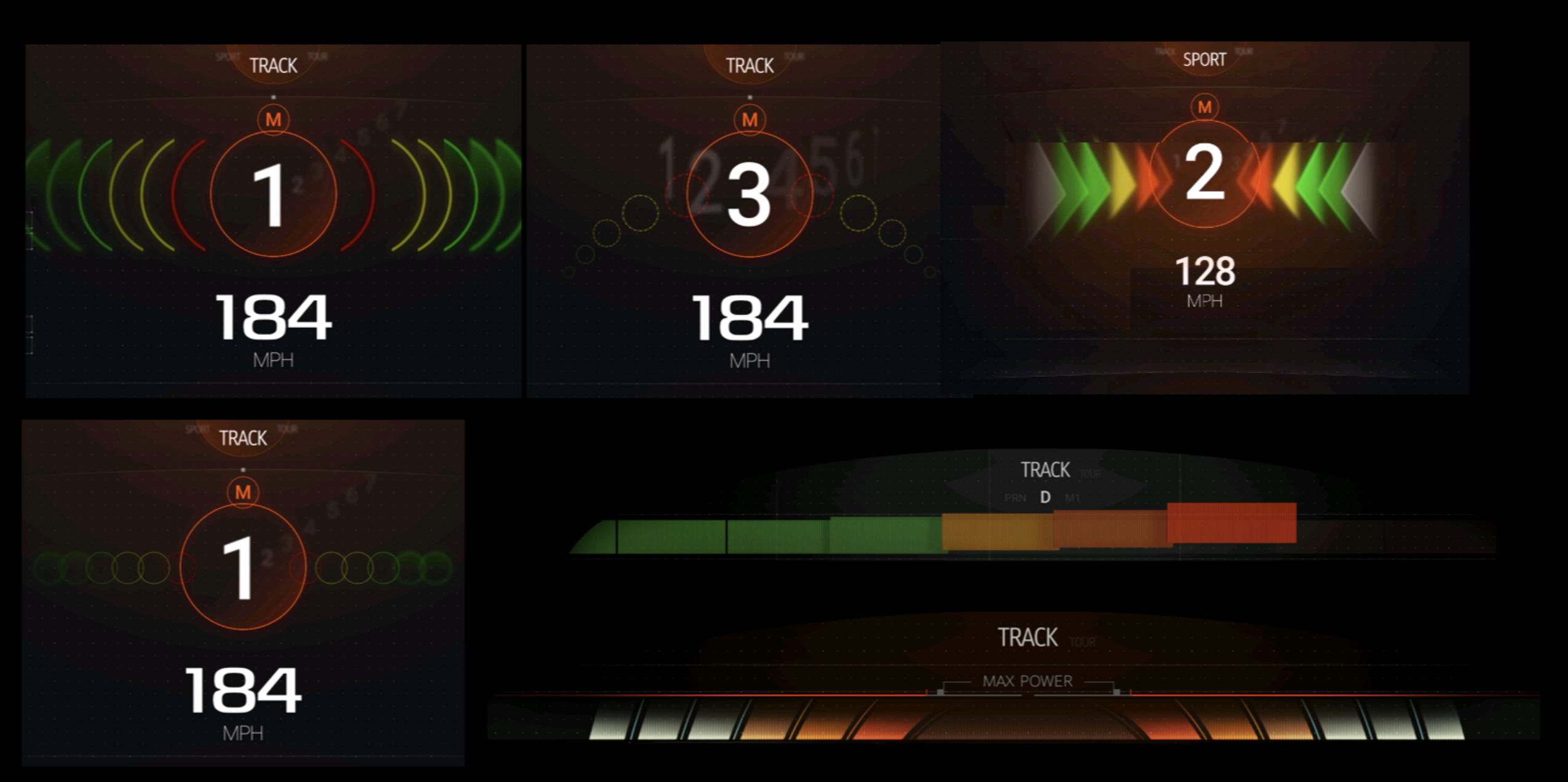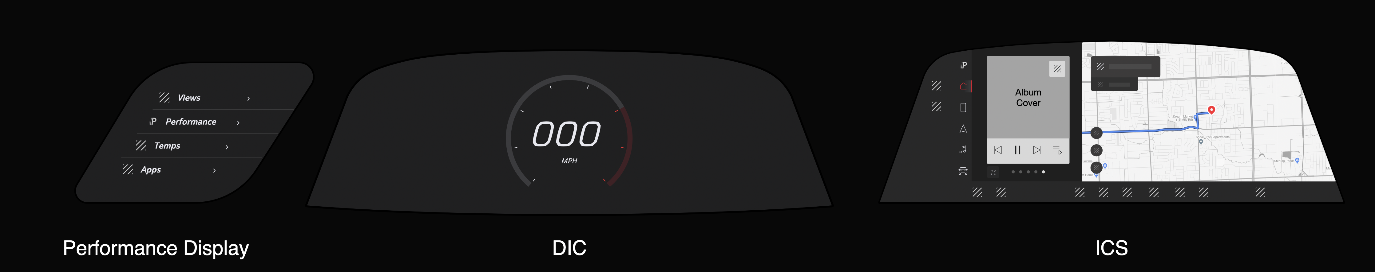 I collaborated with engineering and design on the size and proportion of these displays. After leading the vision for the branded differentiation I led the design direction for these display themes as well as reviews and critiques for the UX team working on these displays. I was then responsible for taking this work to cross discipline teams and partners to present, review, showcase and often times sell and get approval for our studio direction and vision for the brand and vehicles.