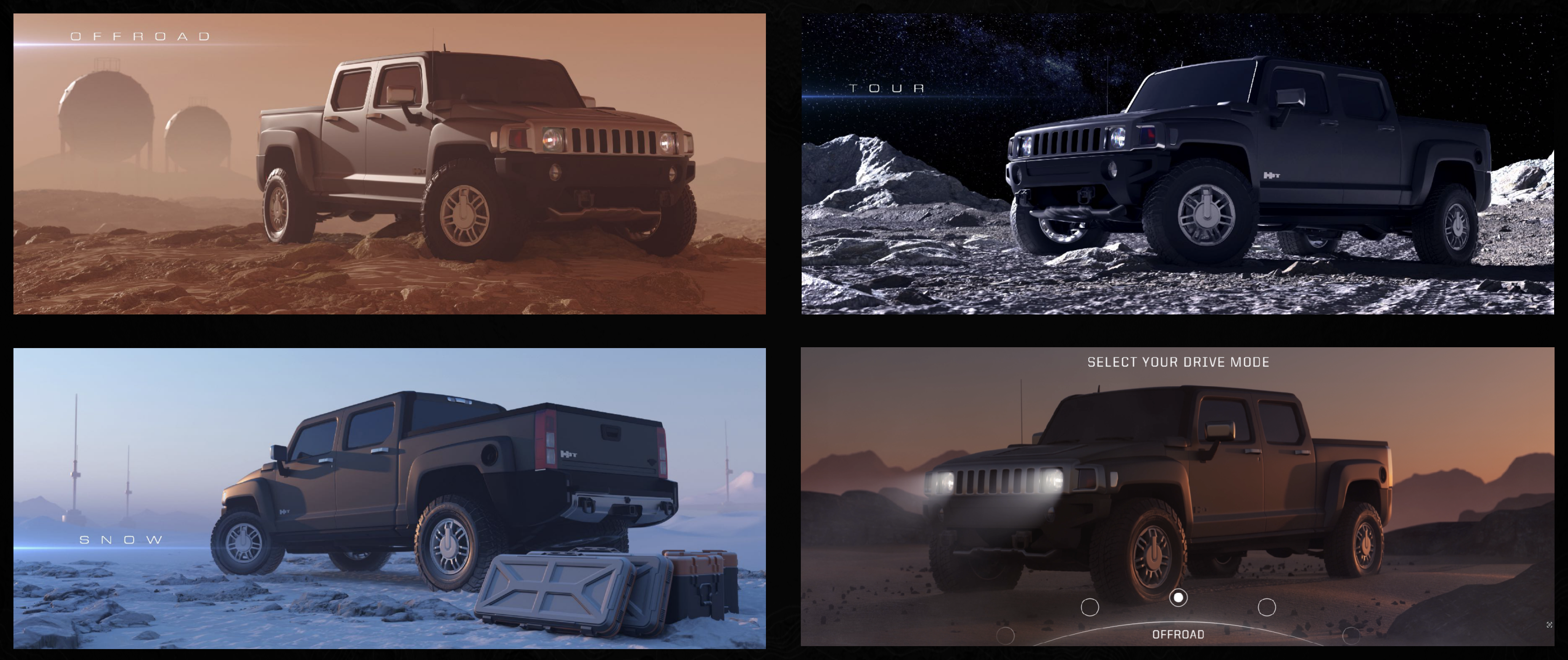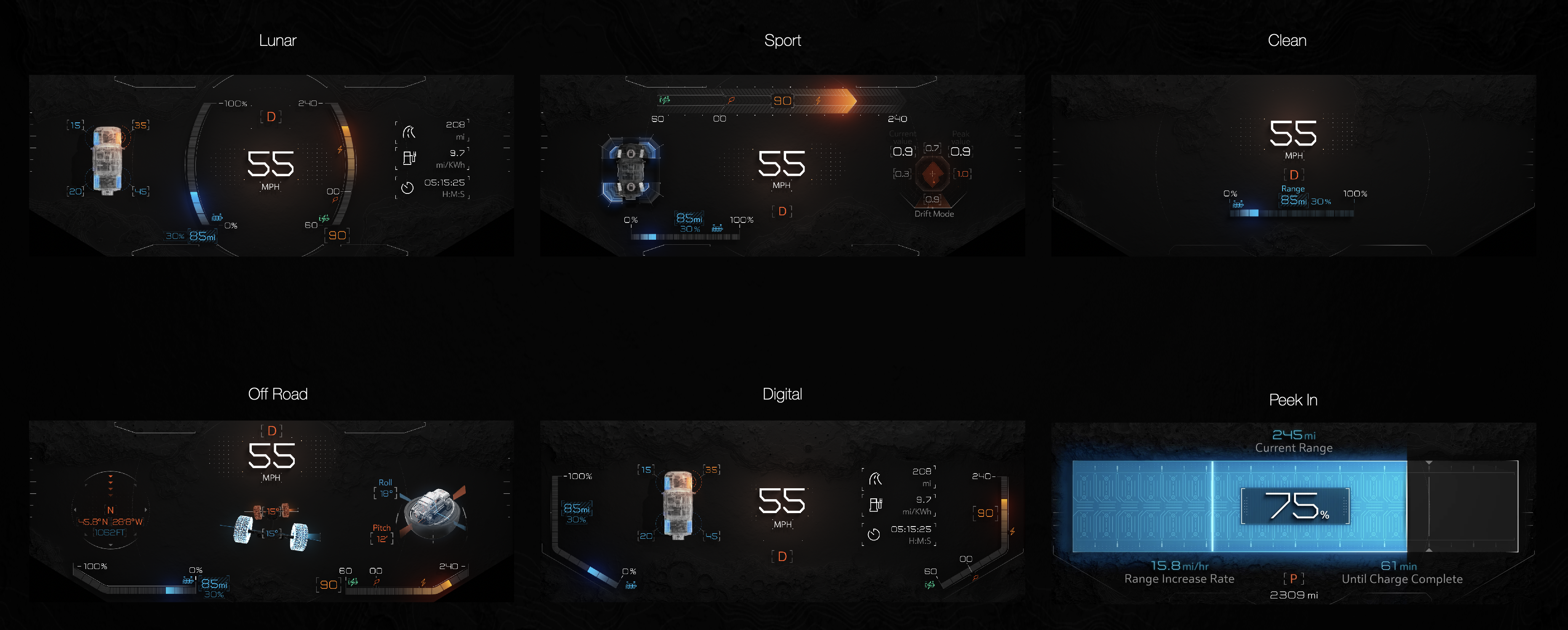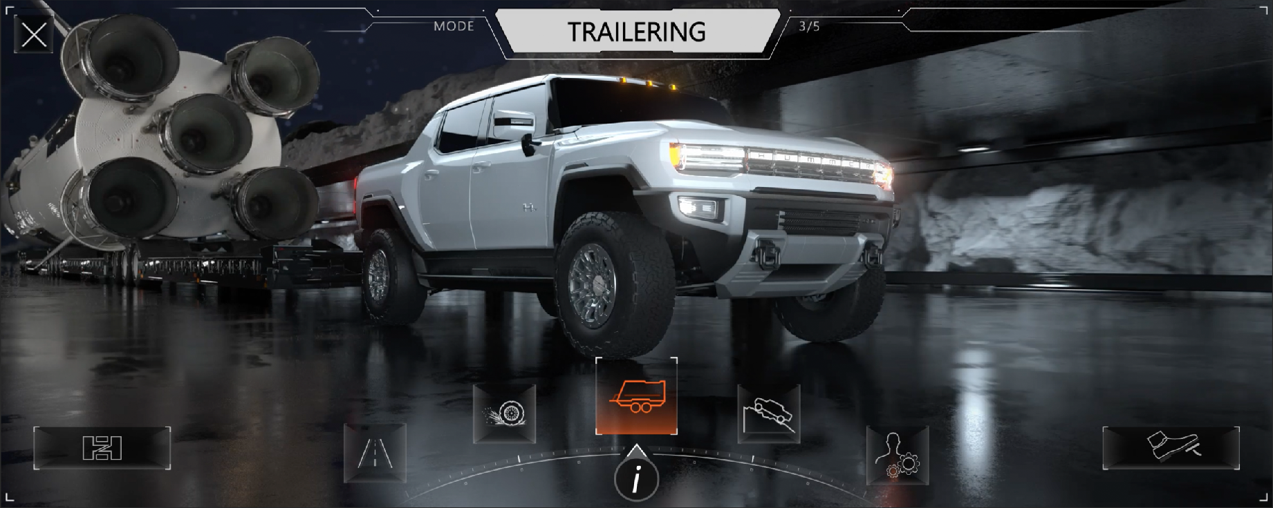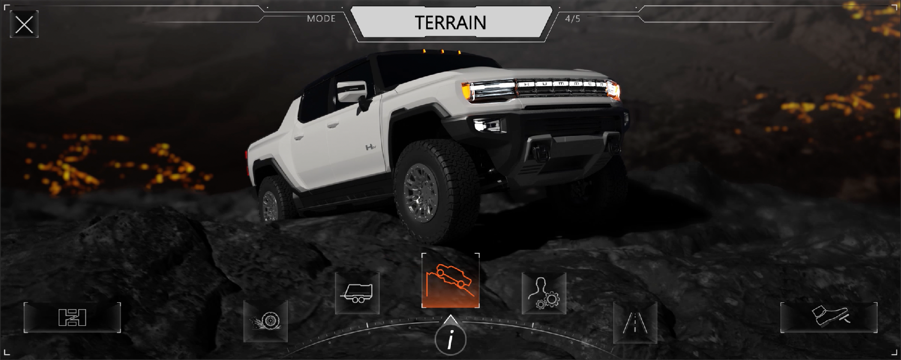 This was one area we really wanted to celebrate and do differently than traditional vehicles. While you still rotate a knob to change the drive mode, in the Hummer EV you get a very brief animatic showing exactly what the Hummer is doing helping to mitigate common customer anxiety over not knowing what the modes do in their vehicle. (A common and substantial customer concern learned during research)