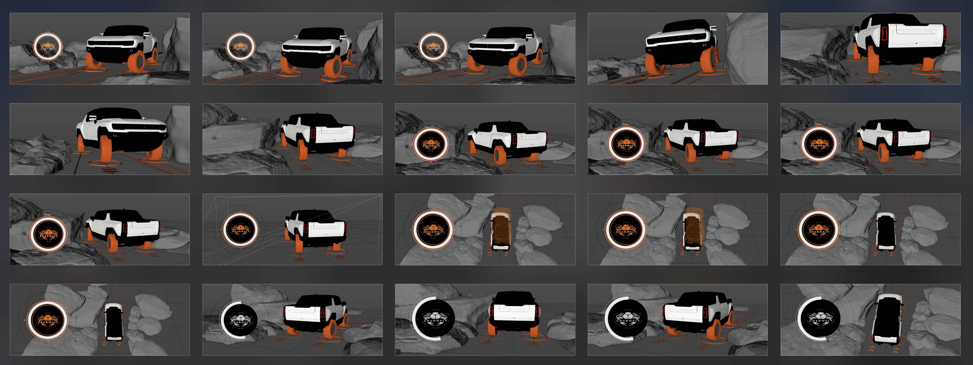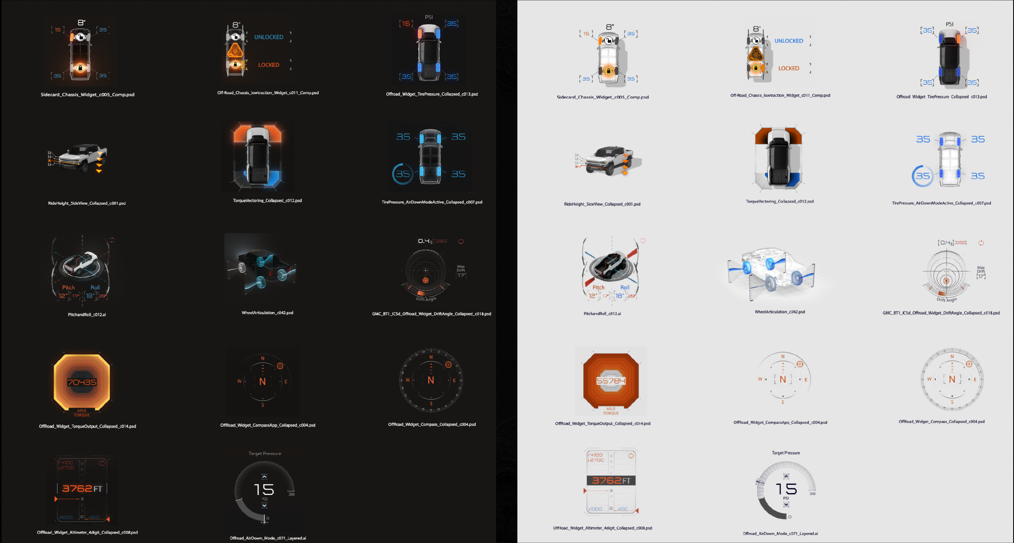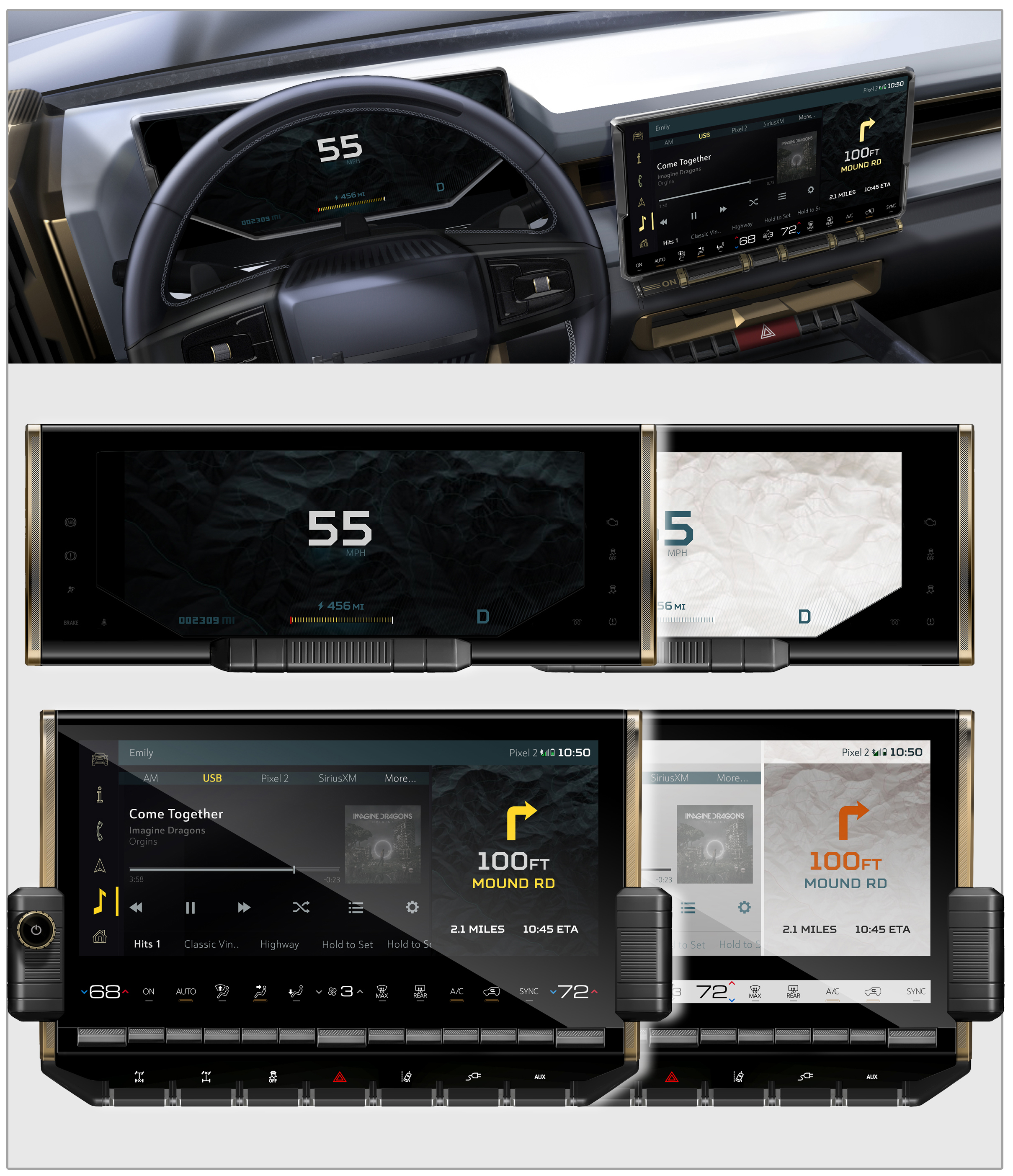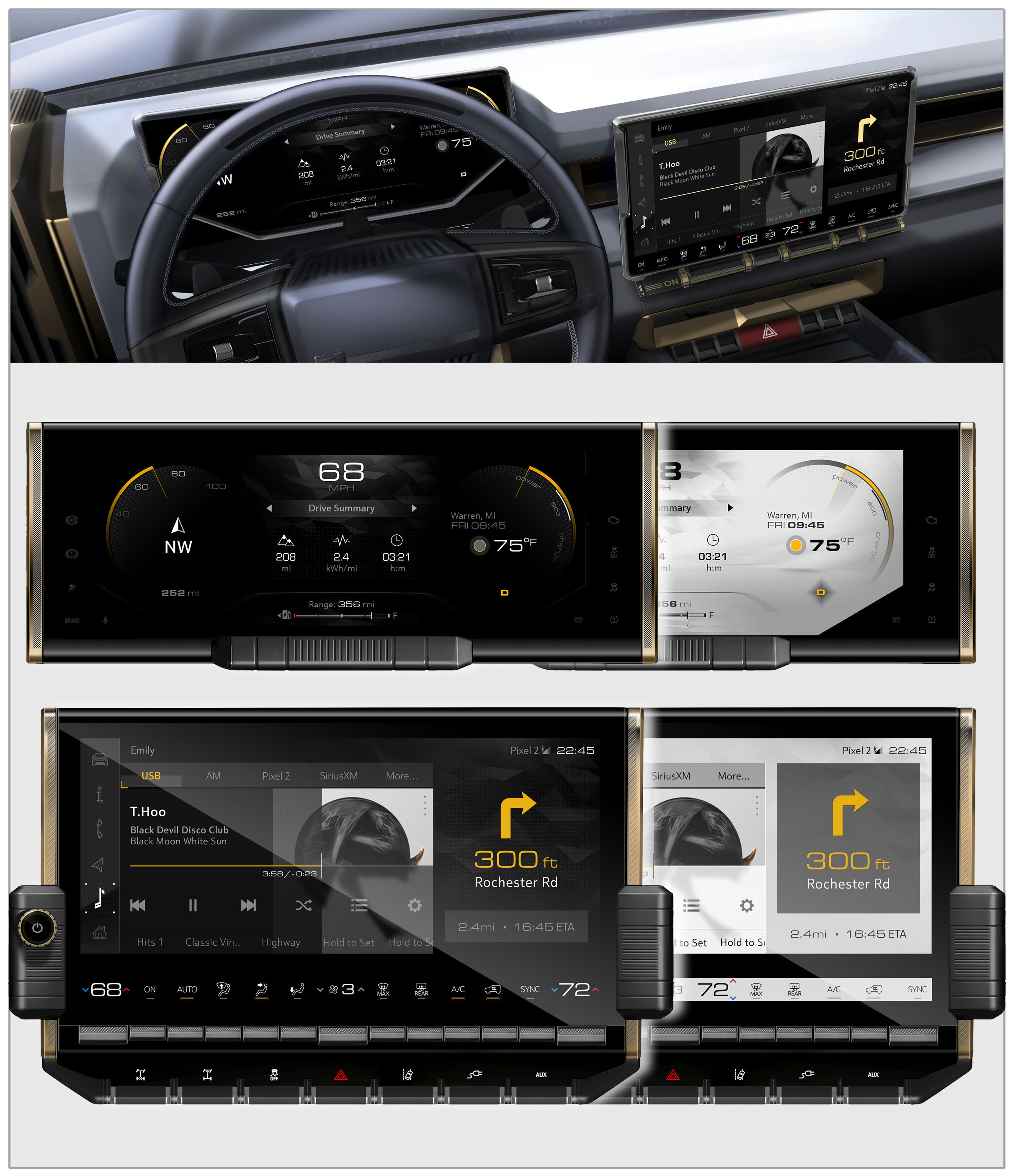 This was one area we really wanted to celebrate and do differently than traditional vehicles. While you still rotate a knob to change the drive mode, in the Hummer EV you get a very brief animatic showing exactly what the Hummer is doing helping to mitigate common customer anxiety over not knowing what the modes do in their vehicle. (A common and substantial customer concern learned during research)