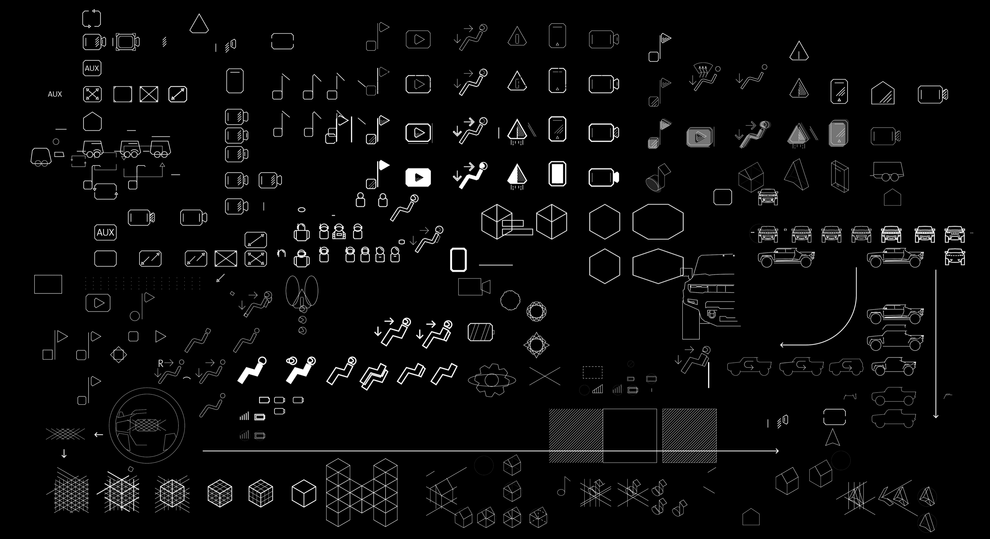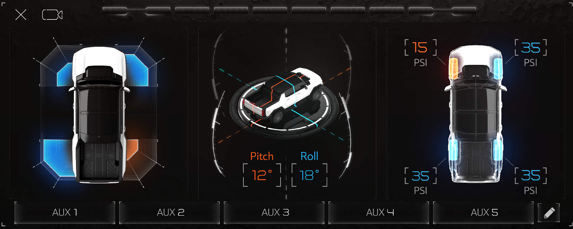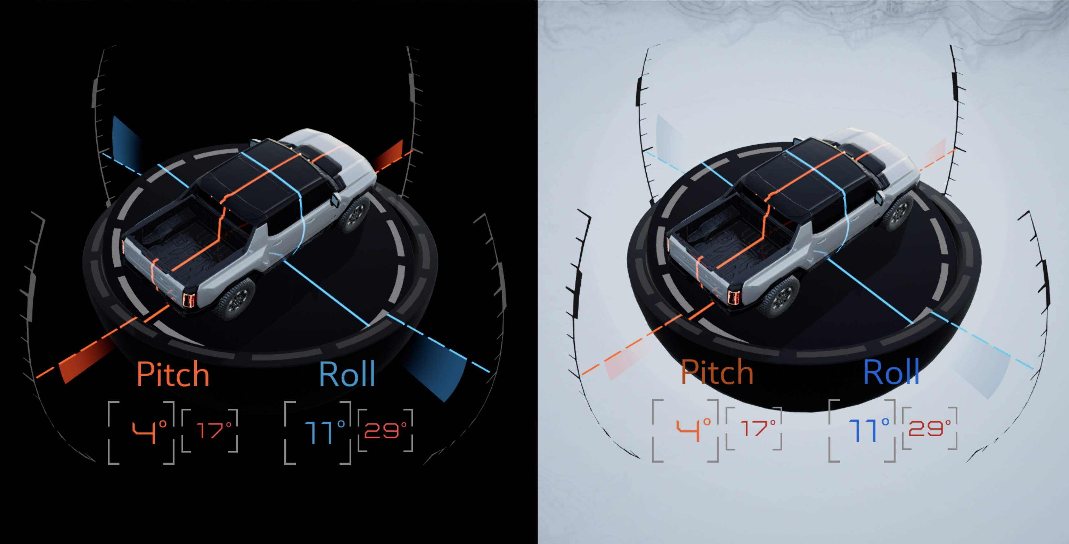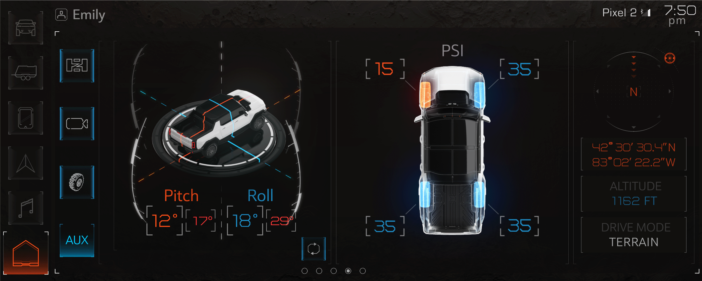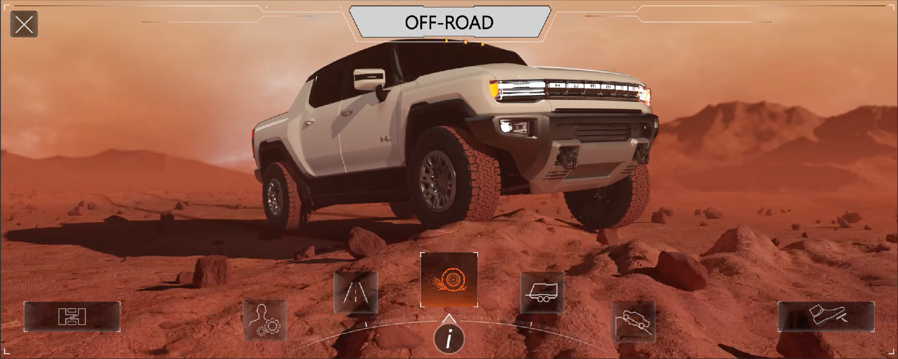Our UX team was led functionally by a balancing act, it must inform yet it can also excite, it can excite yet it must also inform. This drove the identity defining experience cornerstones for the Hummer such as off-road, cameras, trailering, energy, watts to freedom, steering modes and drive modes.