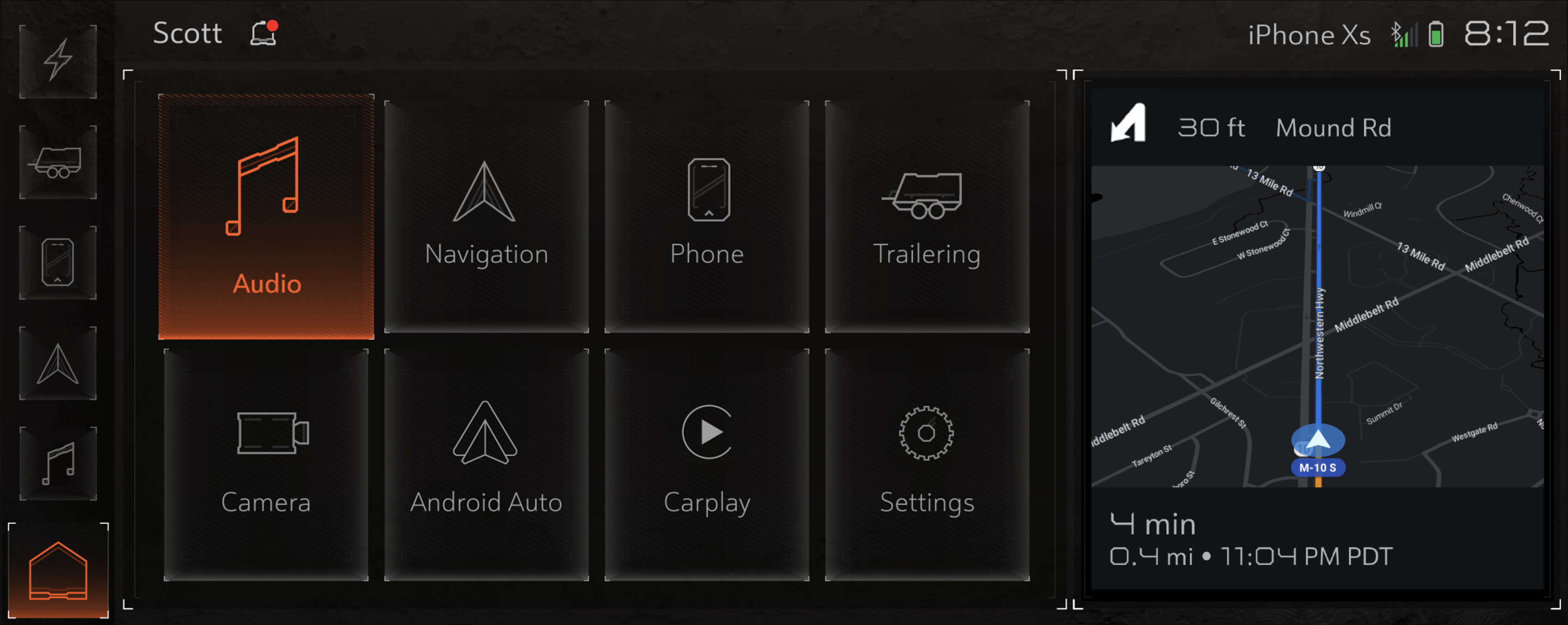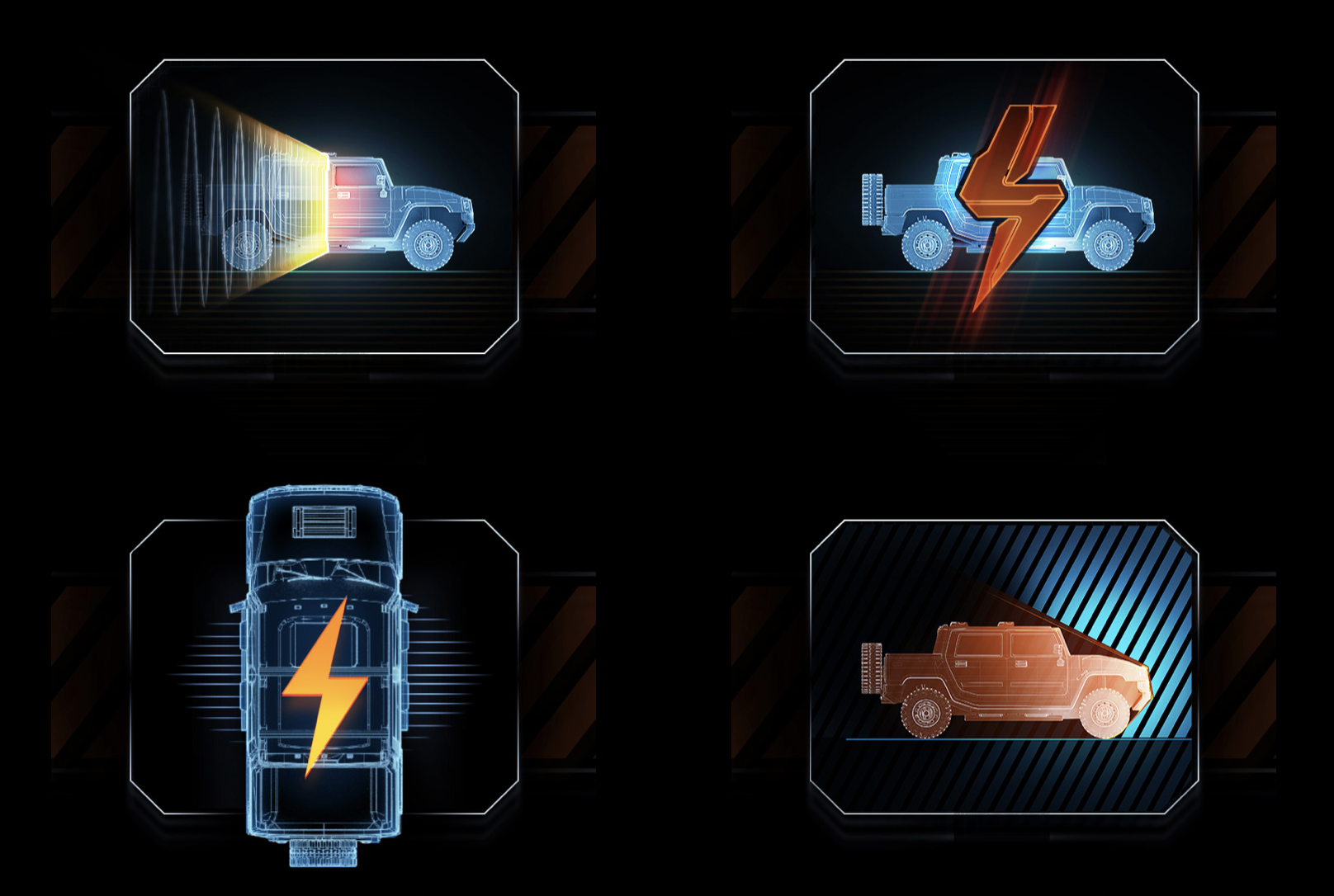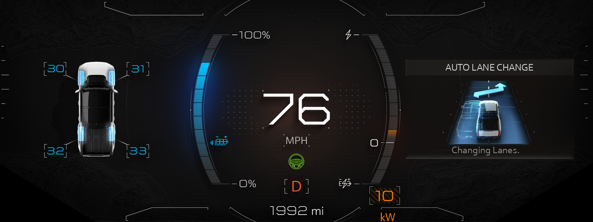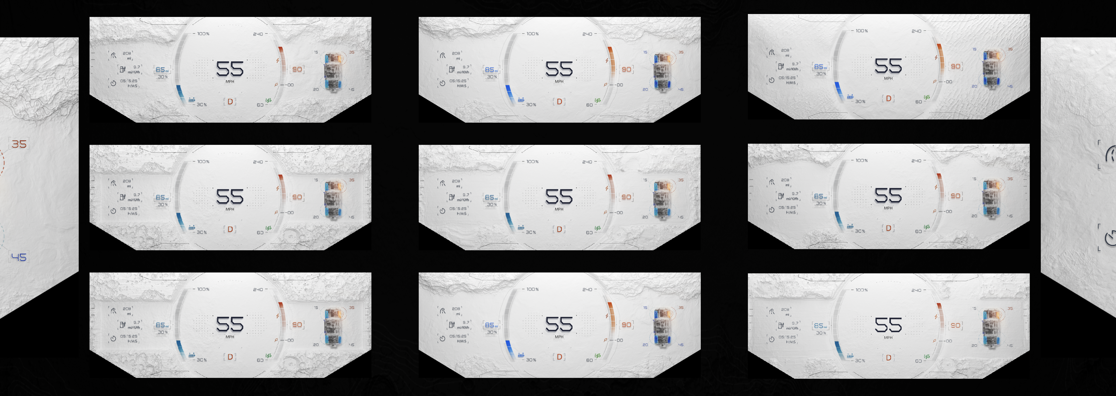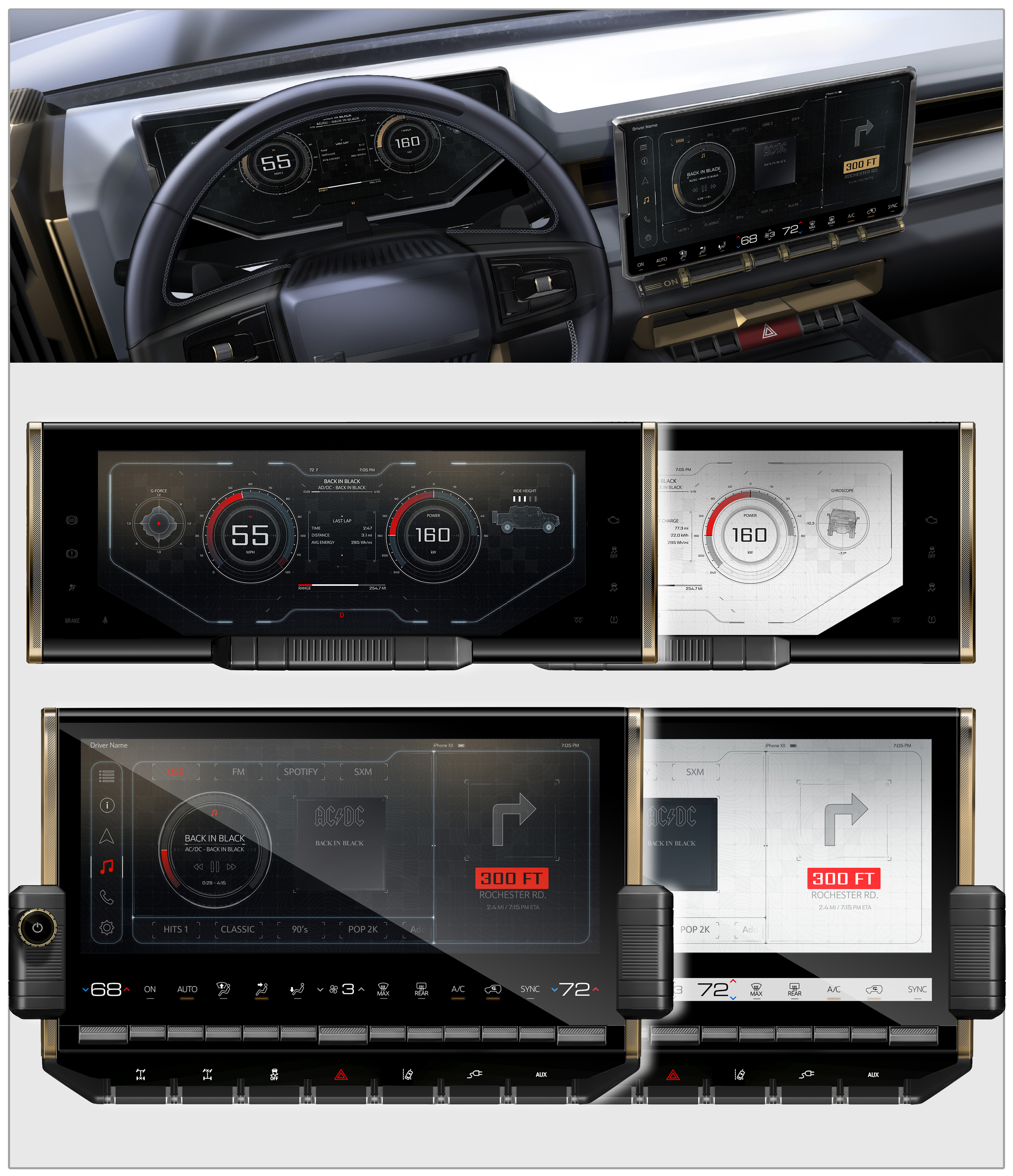 Our UX team was led functionally by a balancing act, it must inform yet it can also excite, it can excite yet it must also inform. This drove the identity defining experience cornerstones for the Hummer such as off-road, cameras, trailering, energy, watts to freedom, steering modes and drive modes.