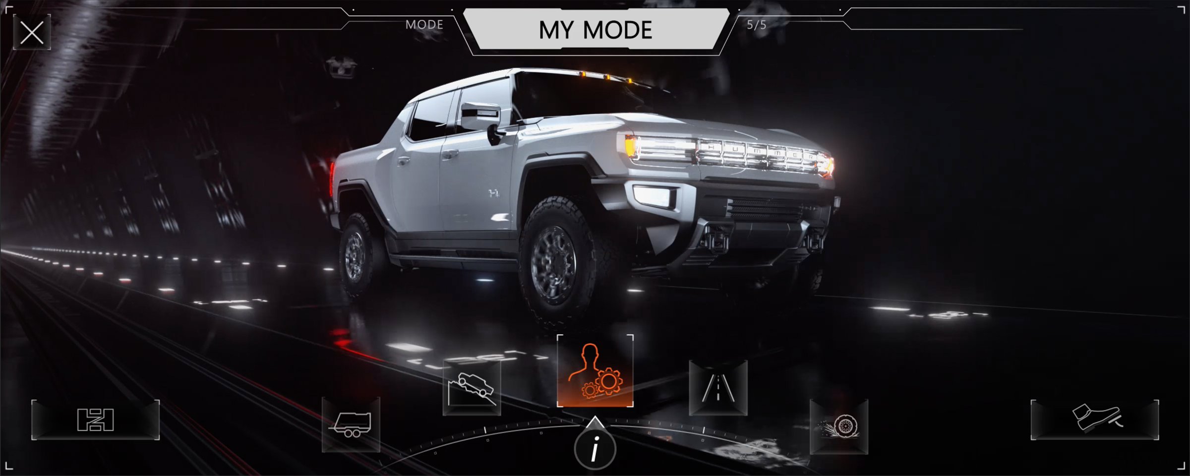 Tour, Off-Road, Terrain, Trailering and My Mode cap off the drive modes available on the Hummer EV. My Mode steps it up a notch allowing the driver to customize different aspects of the driving experience to their feel, offering up more information to learn what these aspects of the vehicle do.