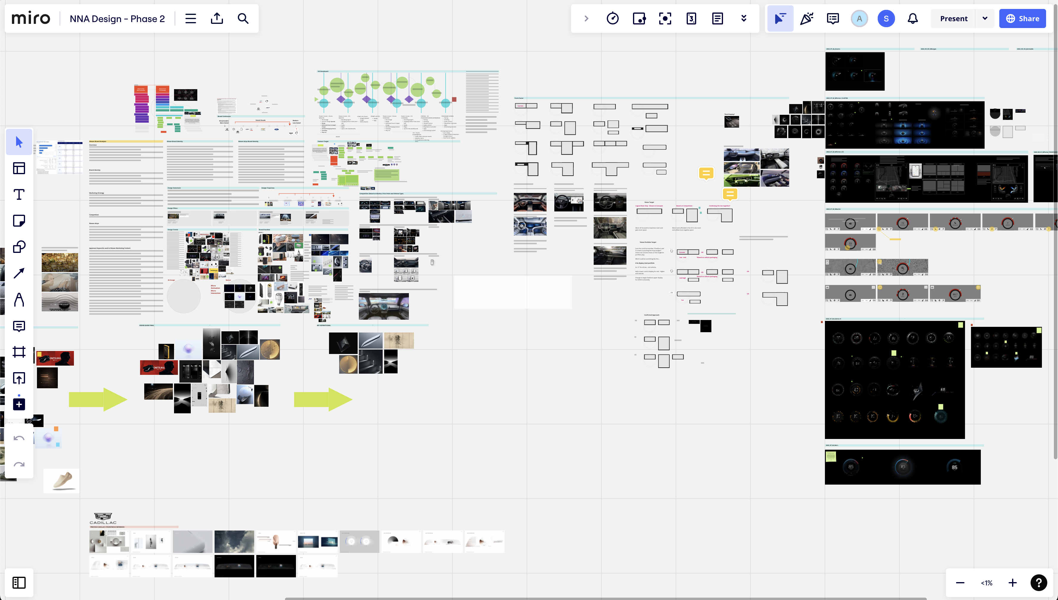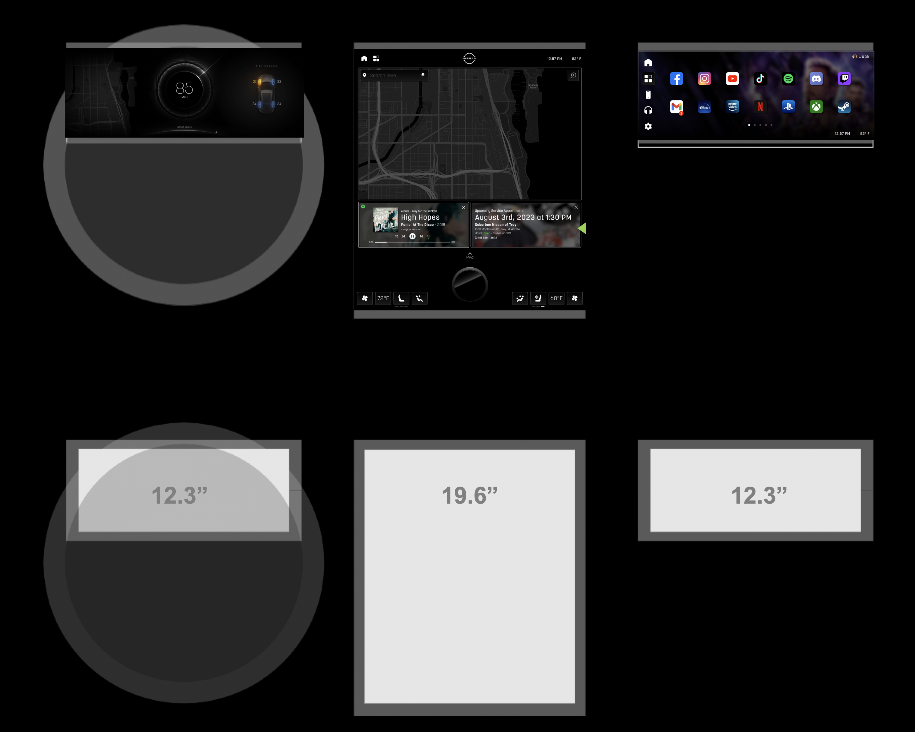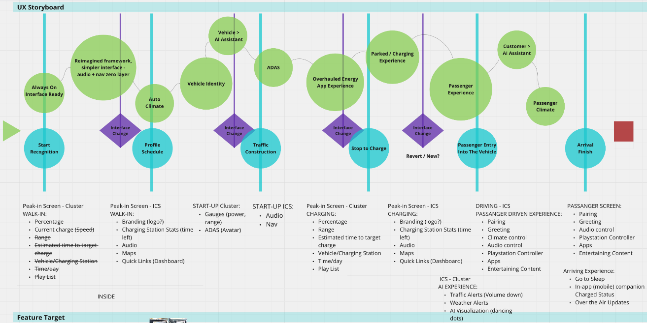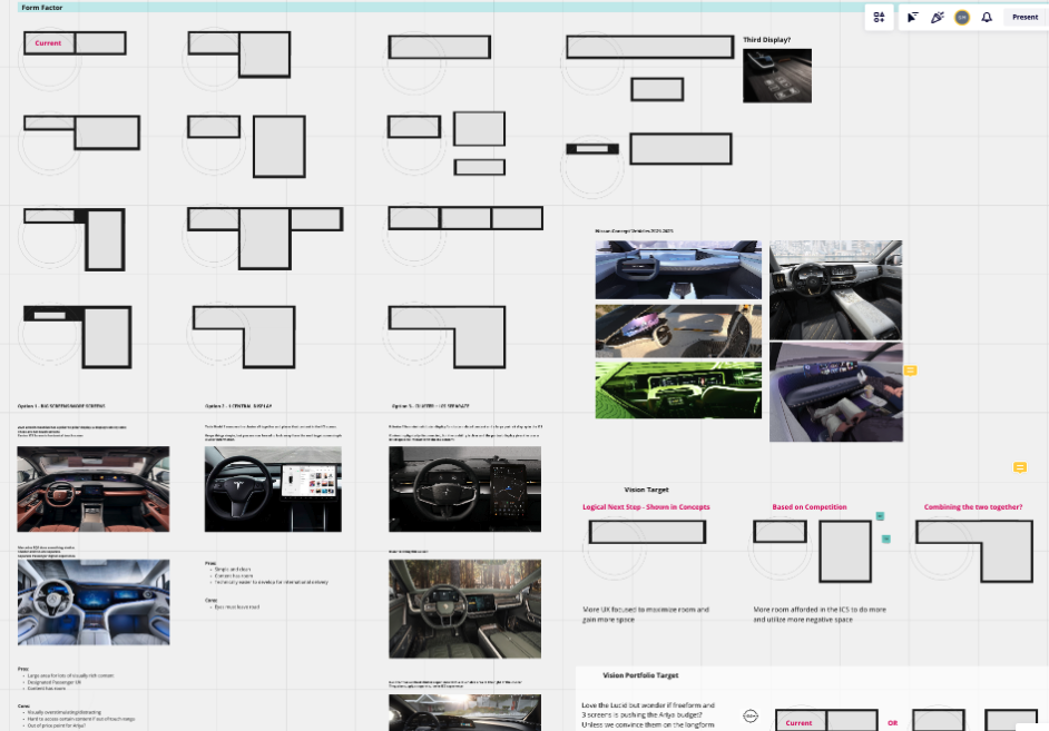 Nissans benchmark was that it currently takes them 6 months to do one screen, we wanted to cut it down to 6 weeks. We were using a smarter pipeline and now we wanted their interface to be smarter, more contextual and more aware of its user. These board vignettes encompass some of our team brainstorming and ideating activities where we used our Nissan Ariya analysis as a foundation to inform what features should be prioritized or removed entirely, what experiences needed to be focused on and what the flow would be. We looked at display shapes, sizes and how that would work into their portfolio high to low even including their upscale brand Infiniti.