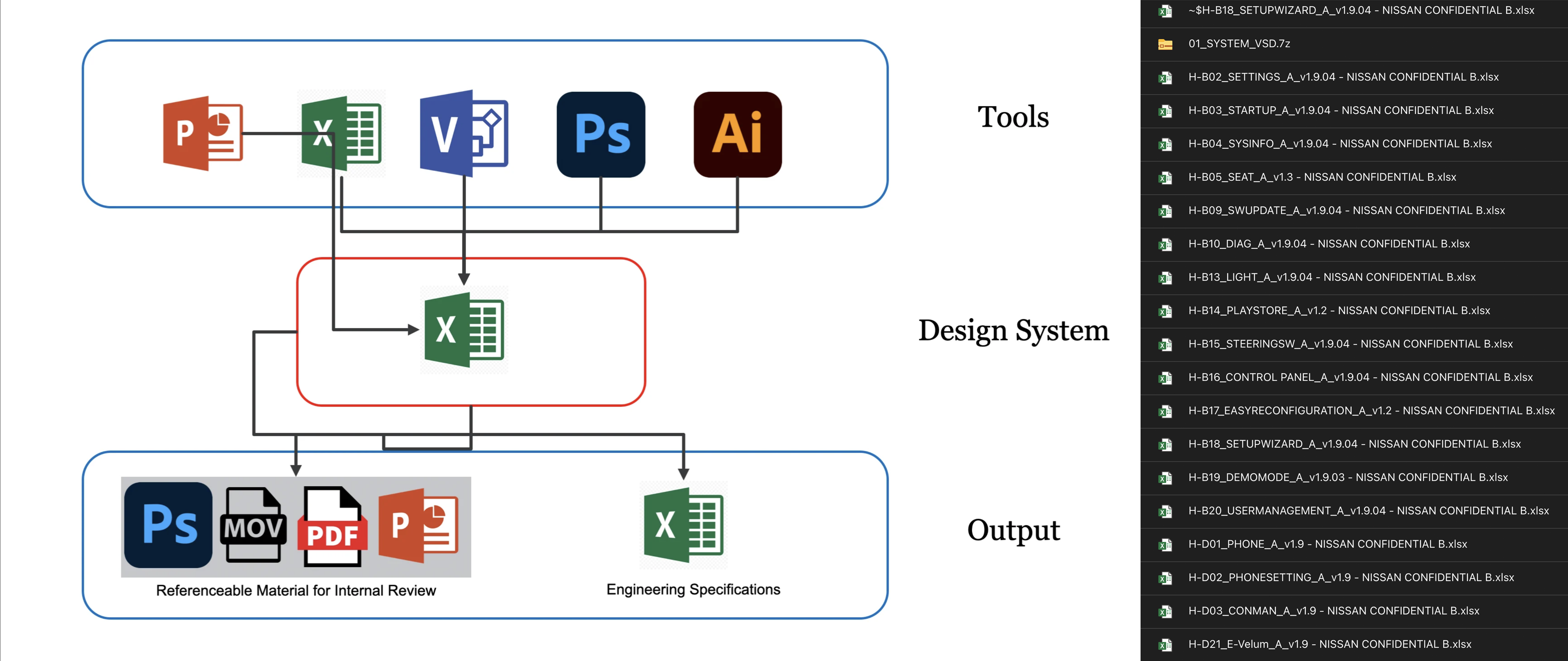 Excel was the largest tool currently used in their existing process with some tables containing thousands upon thousands of referenced files with all wireframes, features, product references, annotations, software notes, documentation and calibrations all completed in Excel.